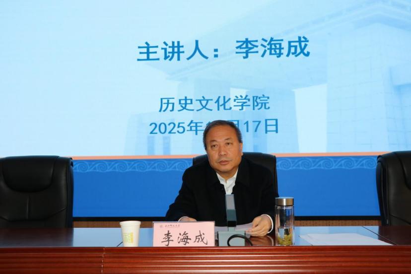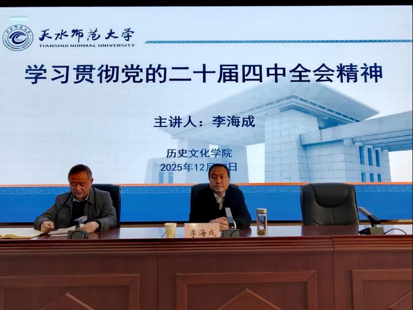 2025年12月17日上午,党委副书记李海成在学校四号报告厅为历史文化学院党委作主题为“勇担新时代文化使命 为谱写中国式现代化甘肃篇章贡献天水师大力量”的二十届四中全会精神专题辅导报告。由历史文化学院党委书记尹志宏主持,全院教职工及部分学生代表参会。